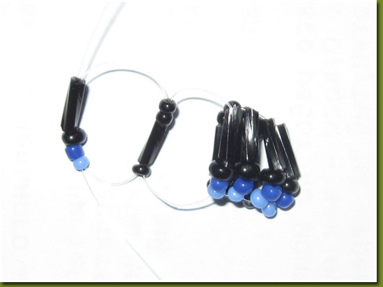 Далі пришила навколо них крошку агату з синьо-голубими бісеринками, за всім відомою технікою “Хутро” (російською – “Мех”). Всі прикраси починаю розшивати від середини, це моє “золоте” правило.