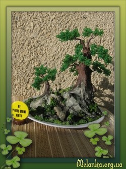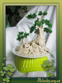 – Садимо дерево у тарілочку, або інший посуд. Для цього ставимо його в ємність, та заливаємо сумішшю гіпсу з водою. Суміш повинна бути рідесенькою, наче рідка сметана. Треба пам’ятати, що гіпс схоплюється (стигне) дуже швидко, десь за 5-10 хвилин, отже треба поспішати.