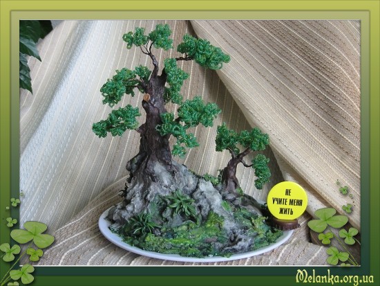 – Коли дерево вже буде стояти самостійно – беремо суміш гіпсу з клеєм ПВА, консистенцією як густа сметана, та формуємо кору дерева. Застосовуємо при цьому тупі предмети різного діаметру та жорсткі кісточки.